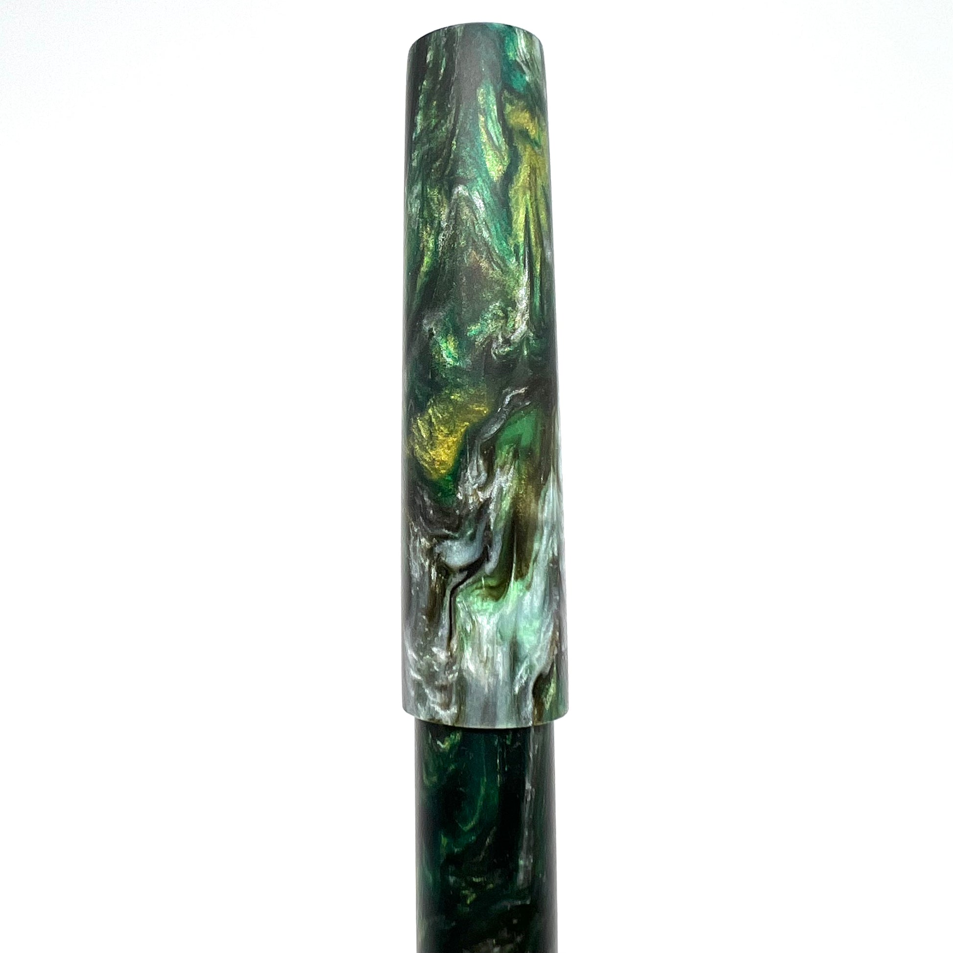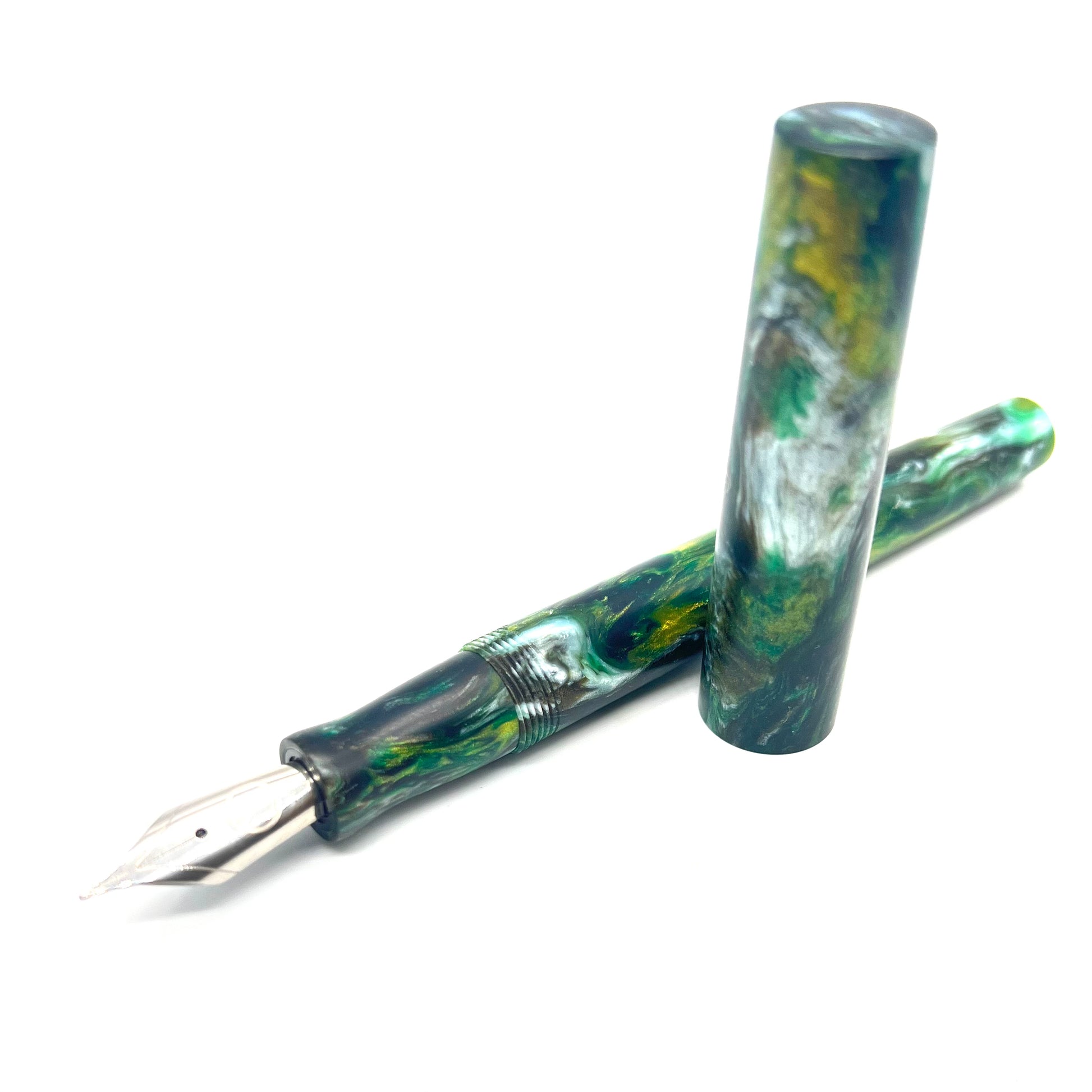 Rainforest colors of greens and a hint of coastal blue swirl to create this beauty of a pen. Pictured finished in our matte satin to give it a more luster look and feel. Comes with your choice of Bock #6 or Jowo #6 nib and converter.