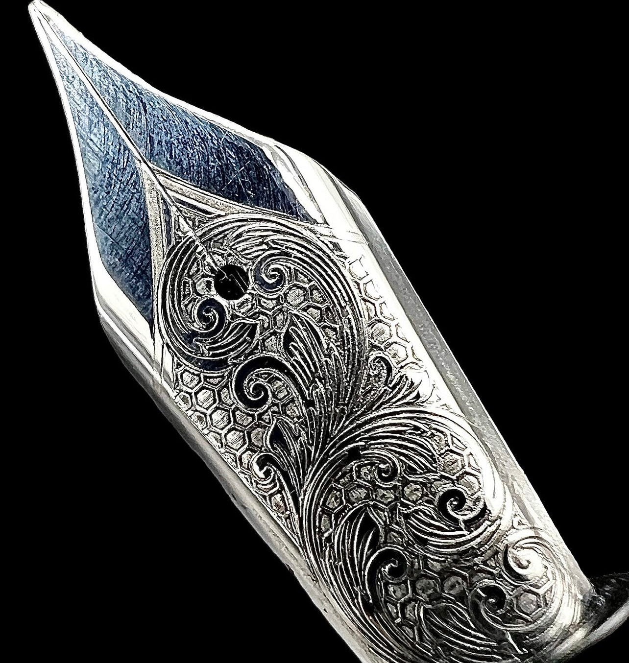 Introducing our exquisitely crafted Steel Nib, a true masterpiece of artistry and functionality. Custom engraved with intricate old-world scrollwork and a captivating honeycomb motif in the background, this nib is more than just a writing tool; it's an expression of individuality and style.