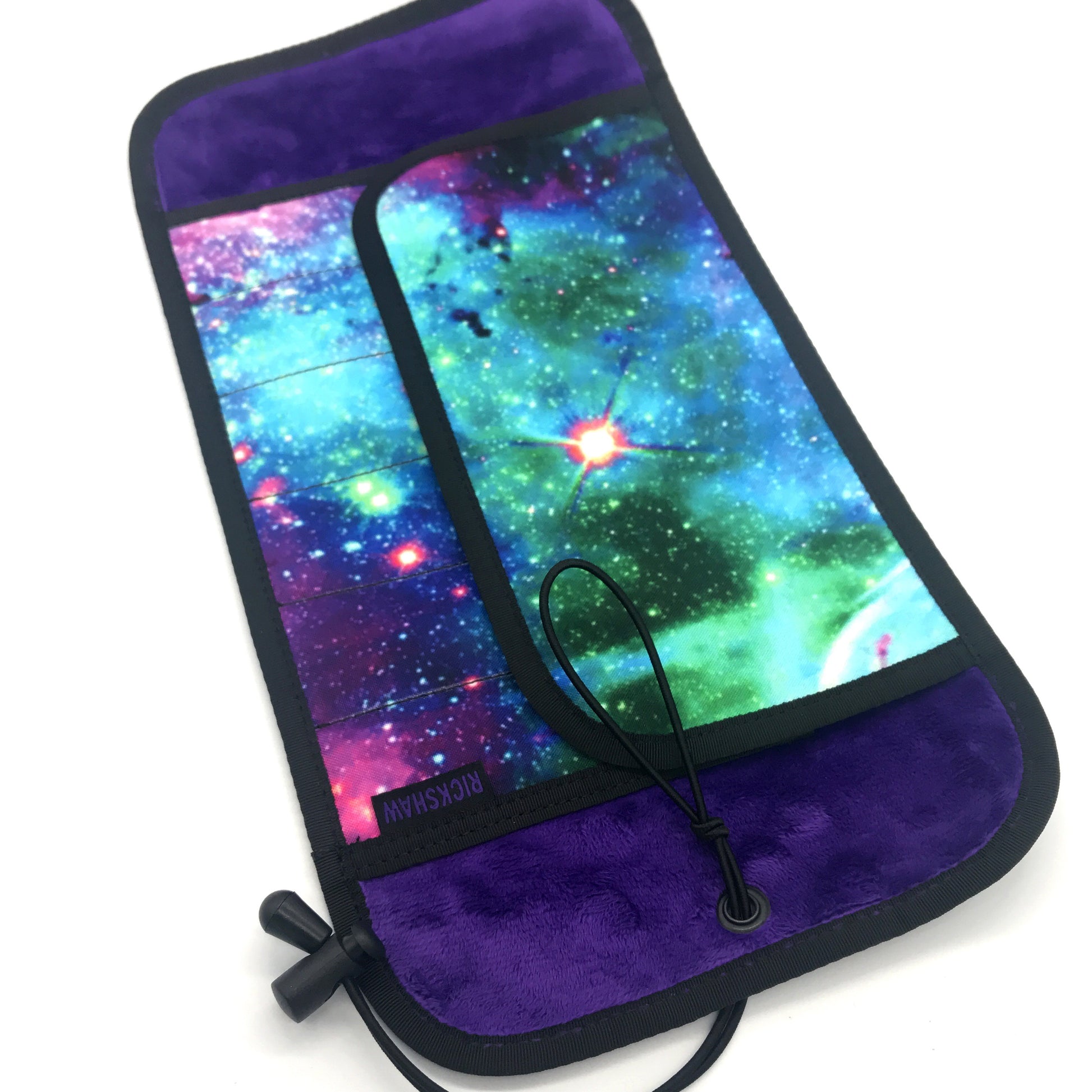Deluxe 6 Pen Roll with super-soft plush interior, for your special pen collection. Nebula is our exclusive design Manufactured in San Francisco from RickShaw Bags. This beautiful Nebula pattern pairs well with our Nebula series pens. Available with a purple or teal plush interior.
