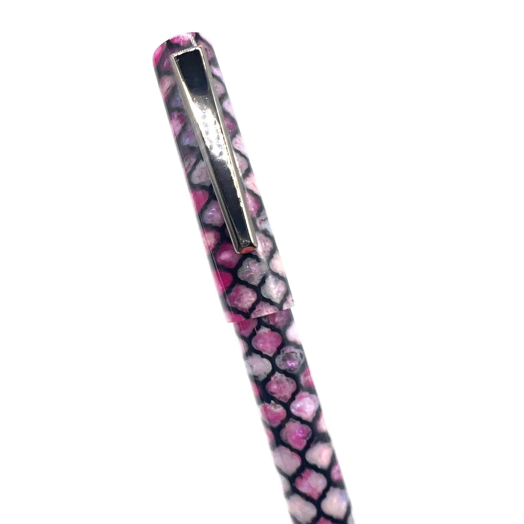 Fuchsia Aura is a stunning quartz with an array of pink colors. These Iridescent colors set in a black motif, mimic this gorgeous stone. (Pictured here in our Westminster style with a gunmetal clip, jowo #6 nib and the Moroccan Lattice motif)