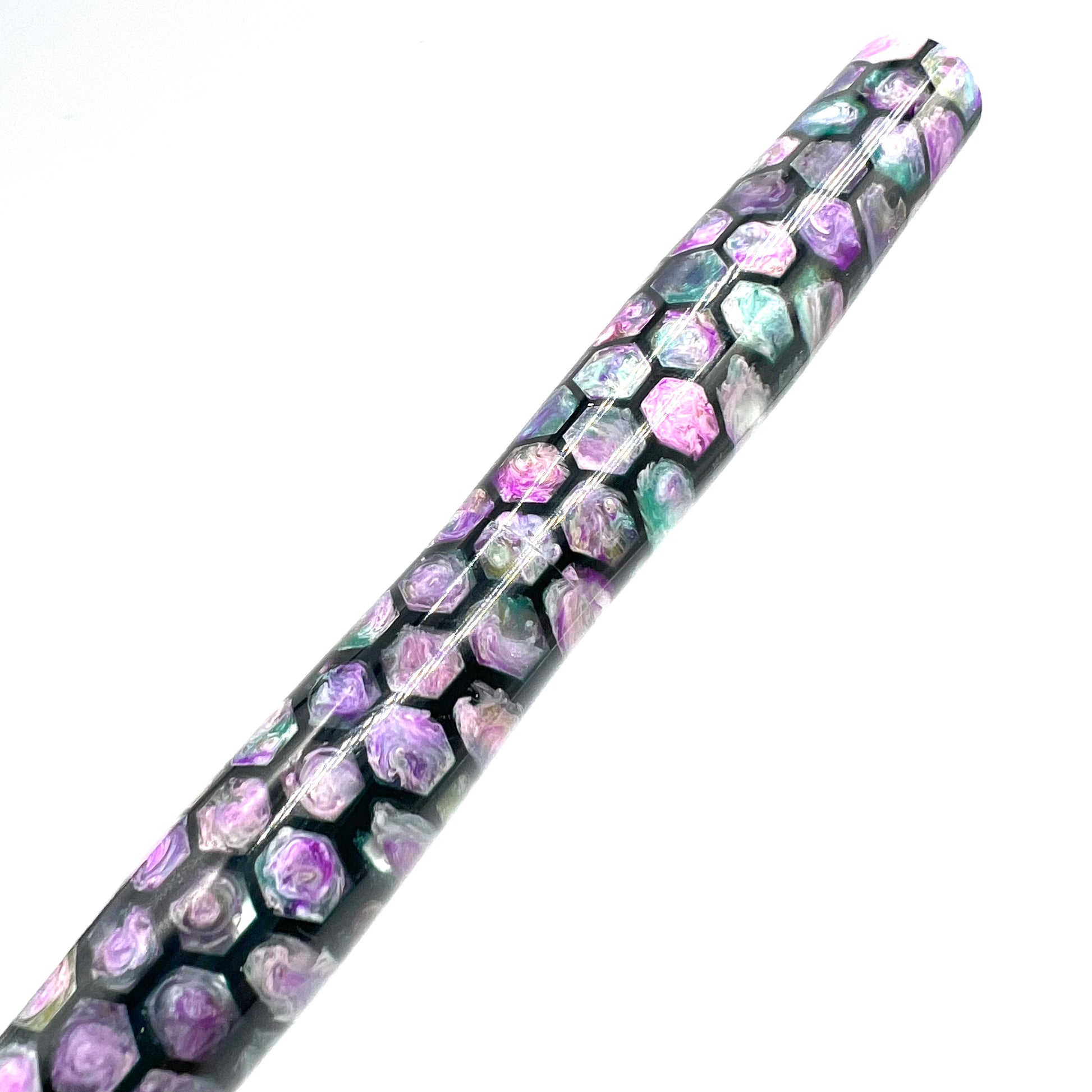 Clear Water Lily is a combination of one of our most signature pours in a motif. Poured with water Lily colors swimming in clear in a dark green matrix. The entire pen, cap, barrel and section align to create one continuous pattern that is pleasing to the eye.