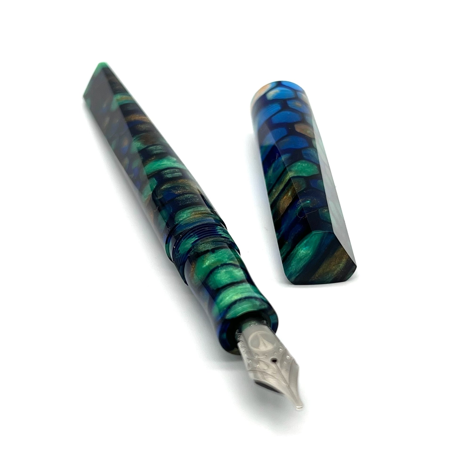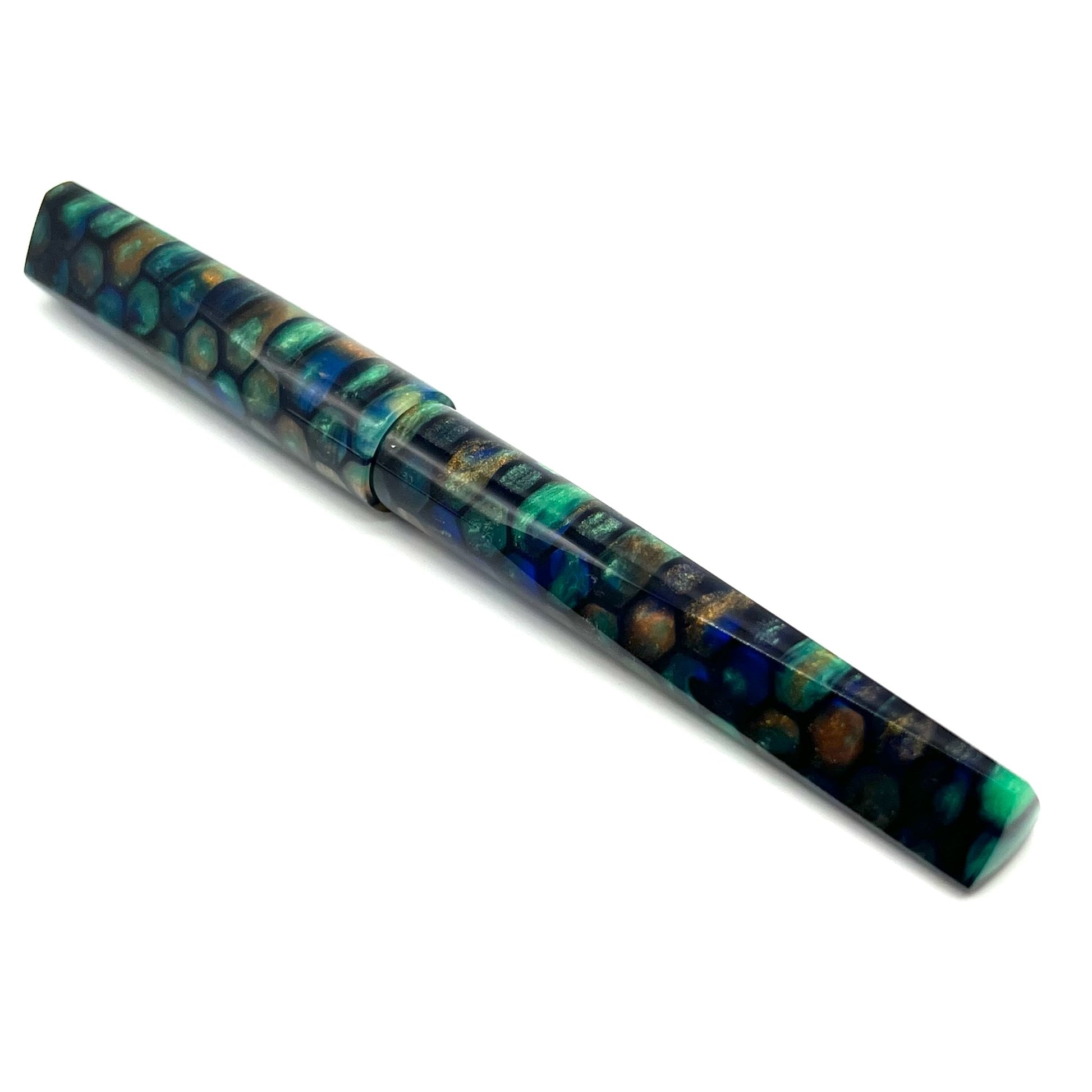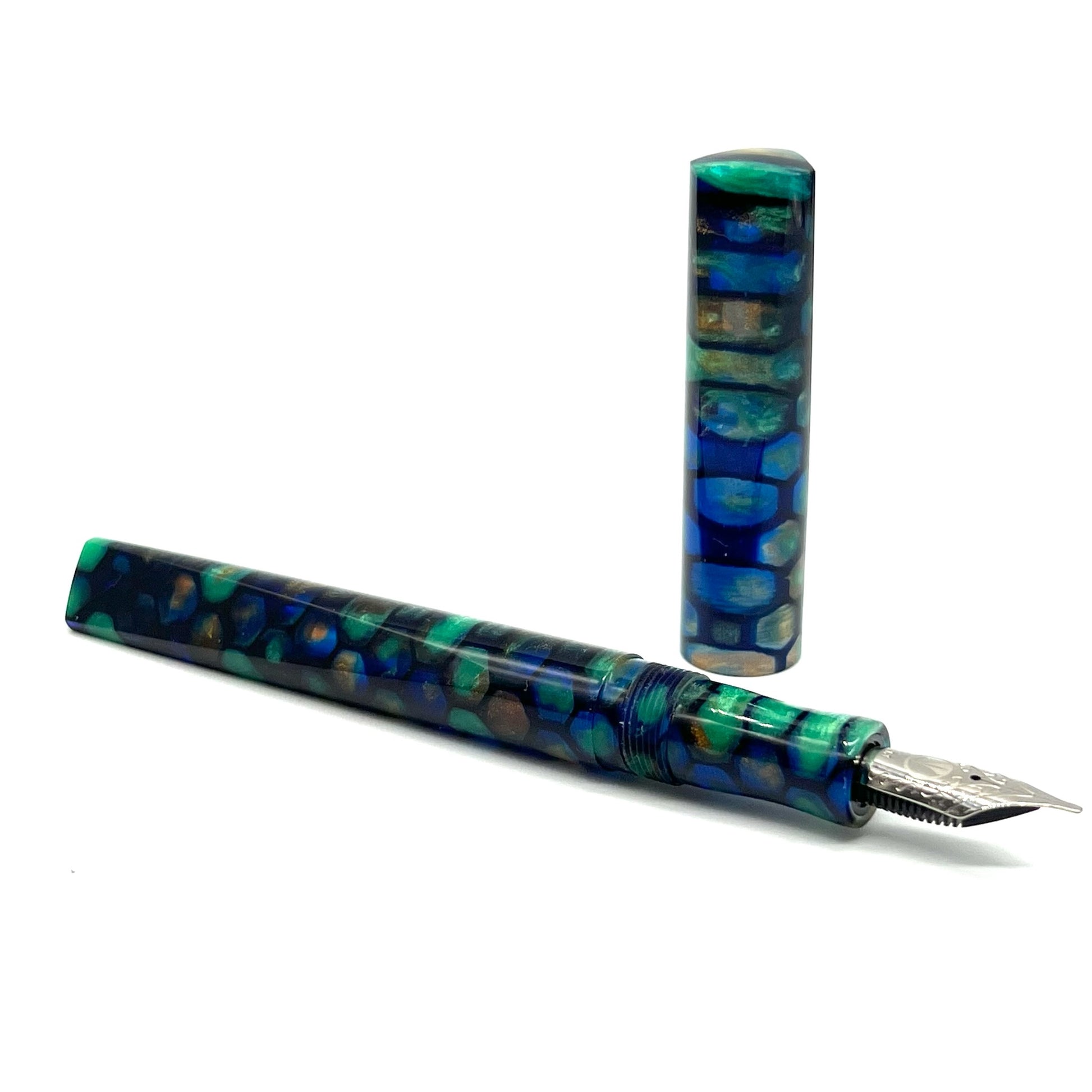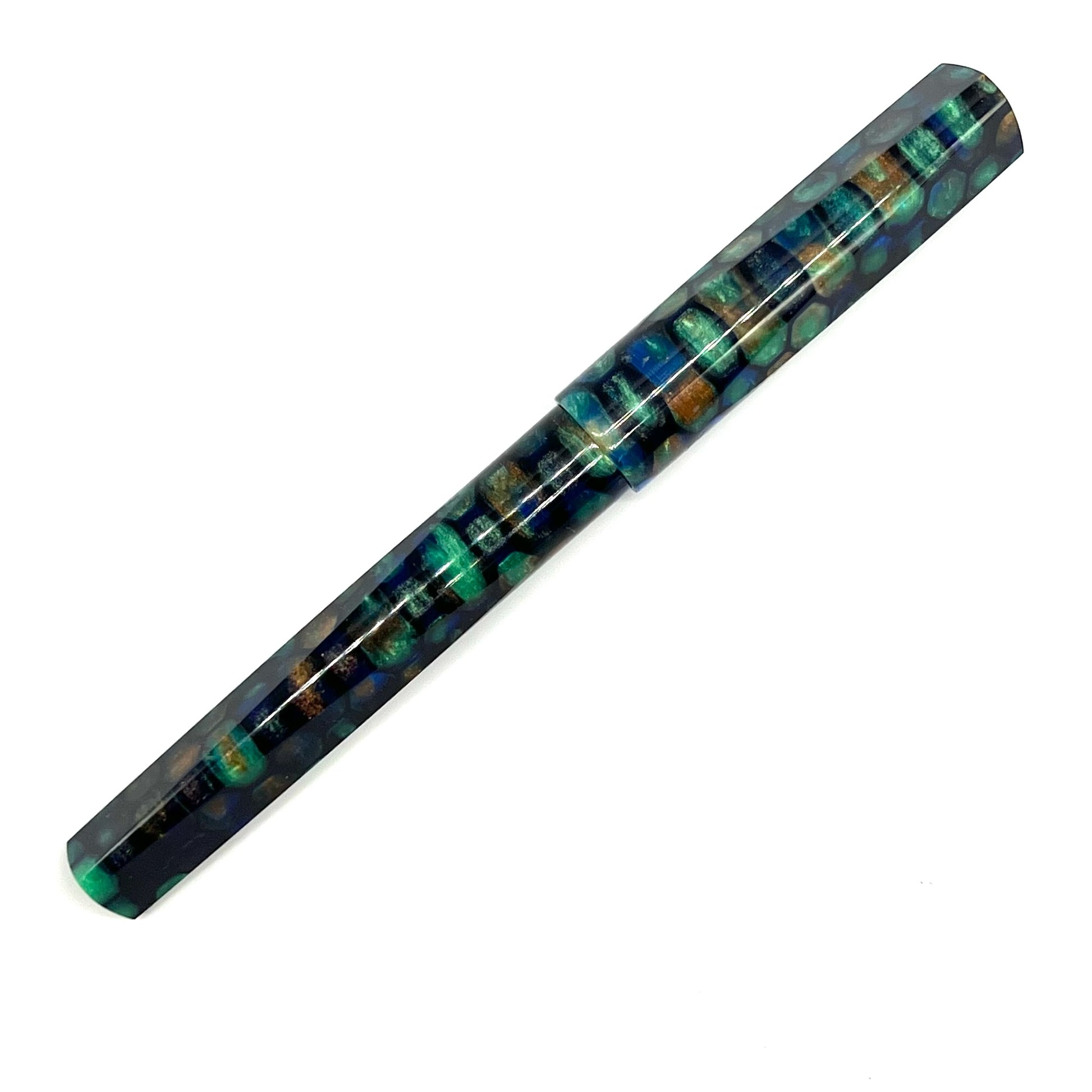 Copper Patina is our popular blank poured in a dark blue matrix. The translucent water-blue areas really add to the depth and beauty of this blank. The entire pen, cap, barrel and section align to create one continuous pattern that is pleasing to the eye.