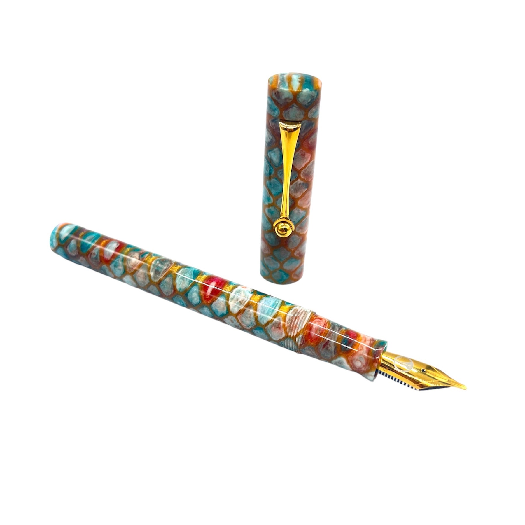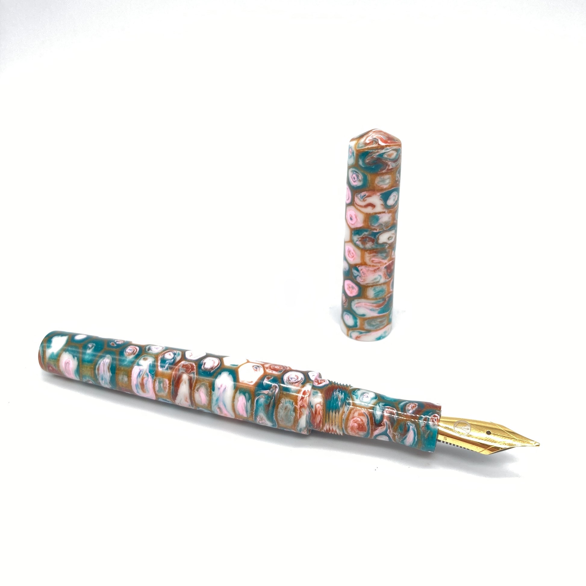 Coral Reef is a combination pour of our beautiful Coral Reef blank. Poured with vibrant teal blue, white, pinkish red and light pink in a golden honeycomb. The entire pen, cap, barrel and section align to create one continuous pattern that is pleasing to the eye.