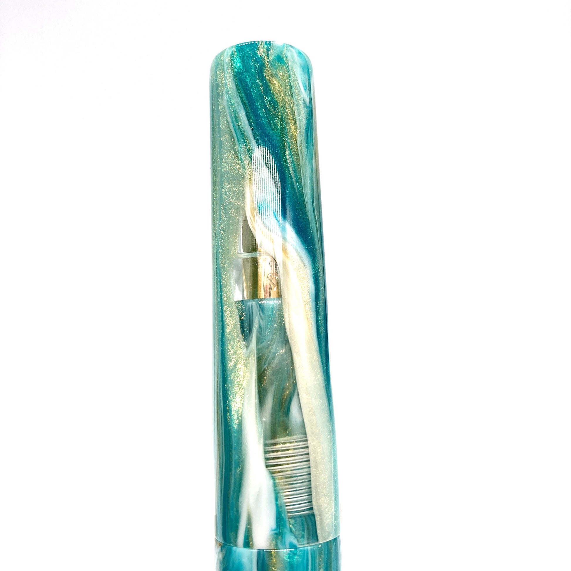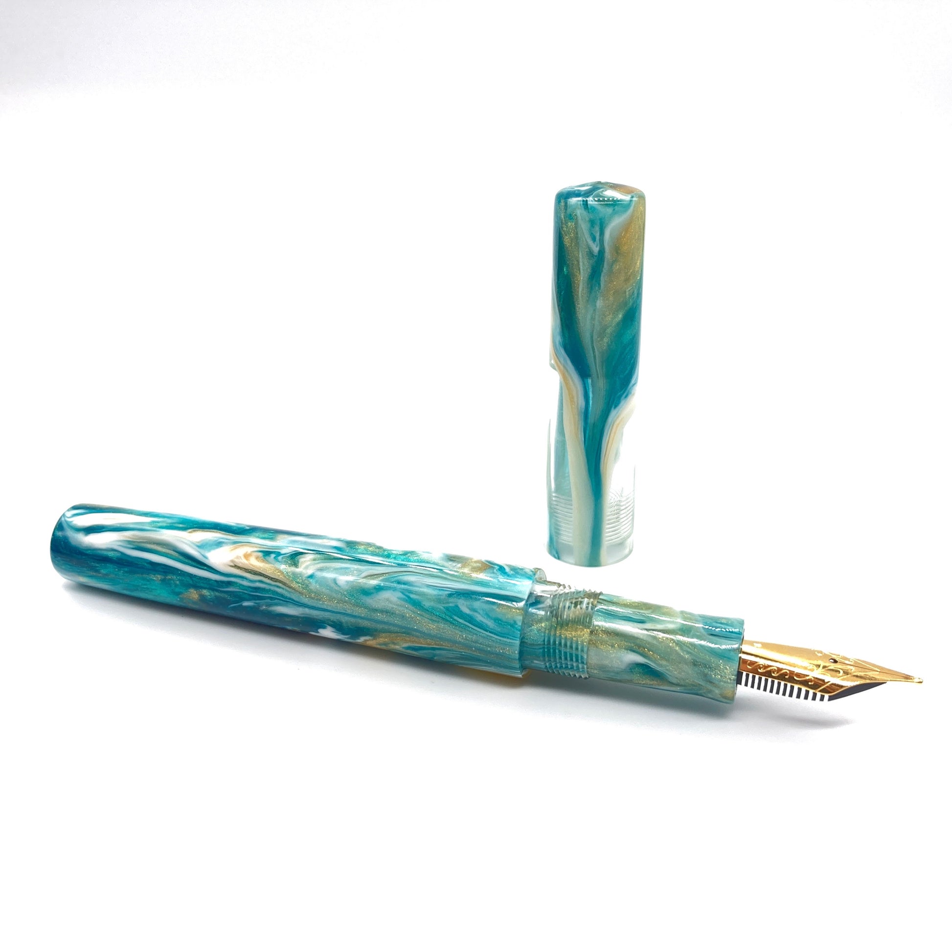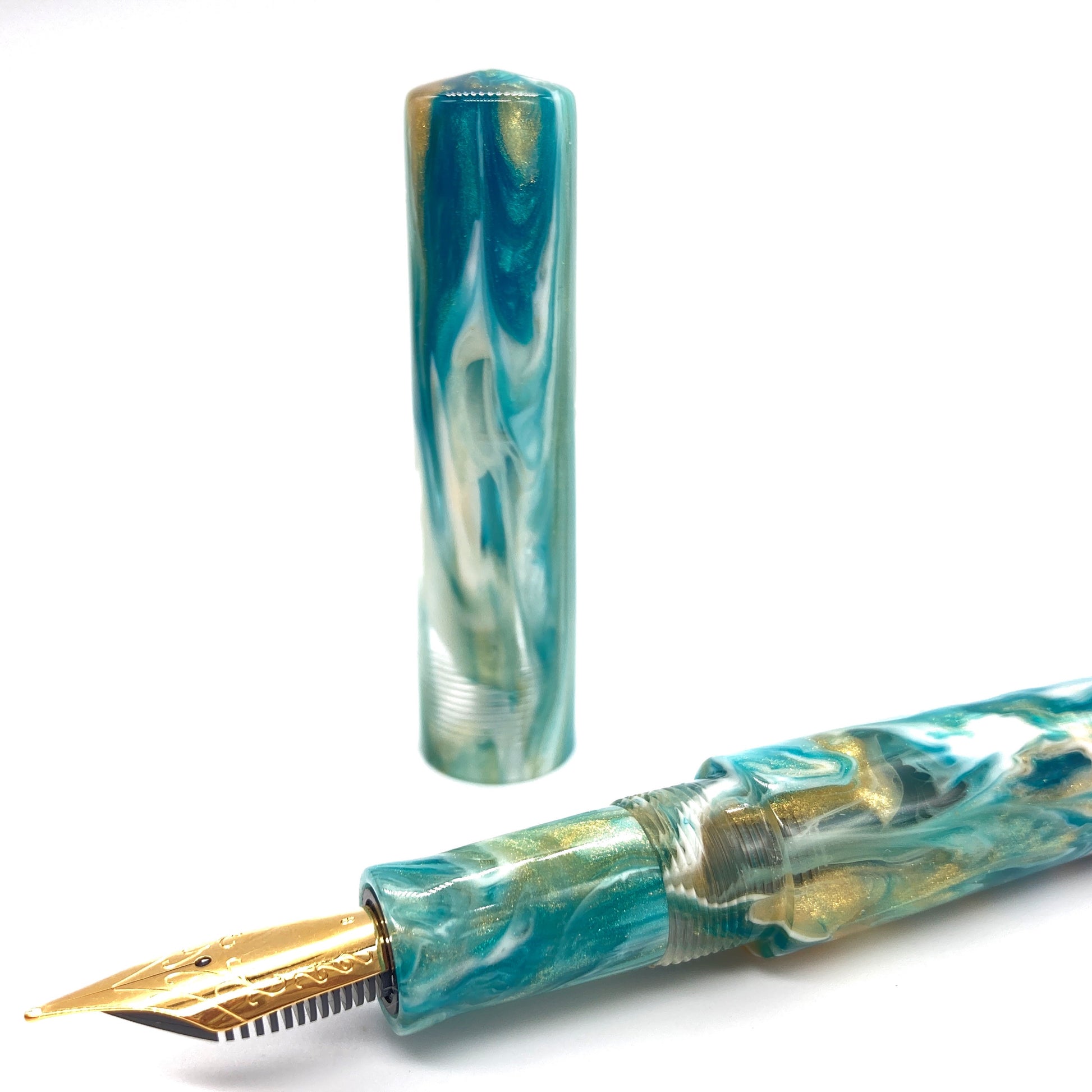 Turquoise waves rolling on golden sands. Envision this tranquility with each turn of the Pen. Beautiful Emerald and Turquoise swirl in with gold and white to create this custom Fountain Pen.