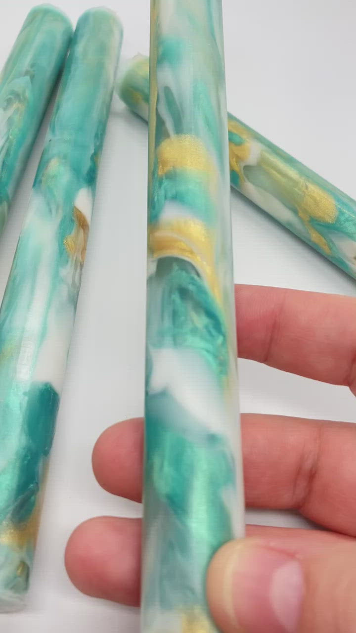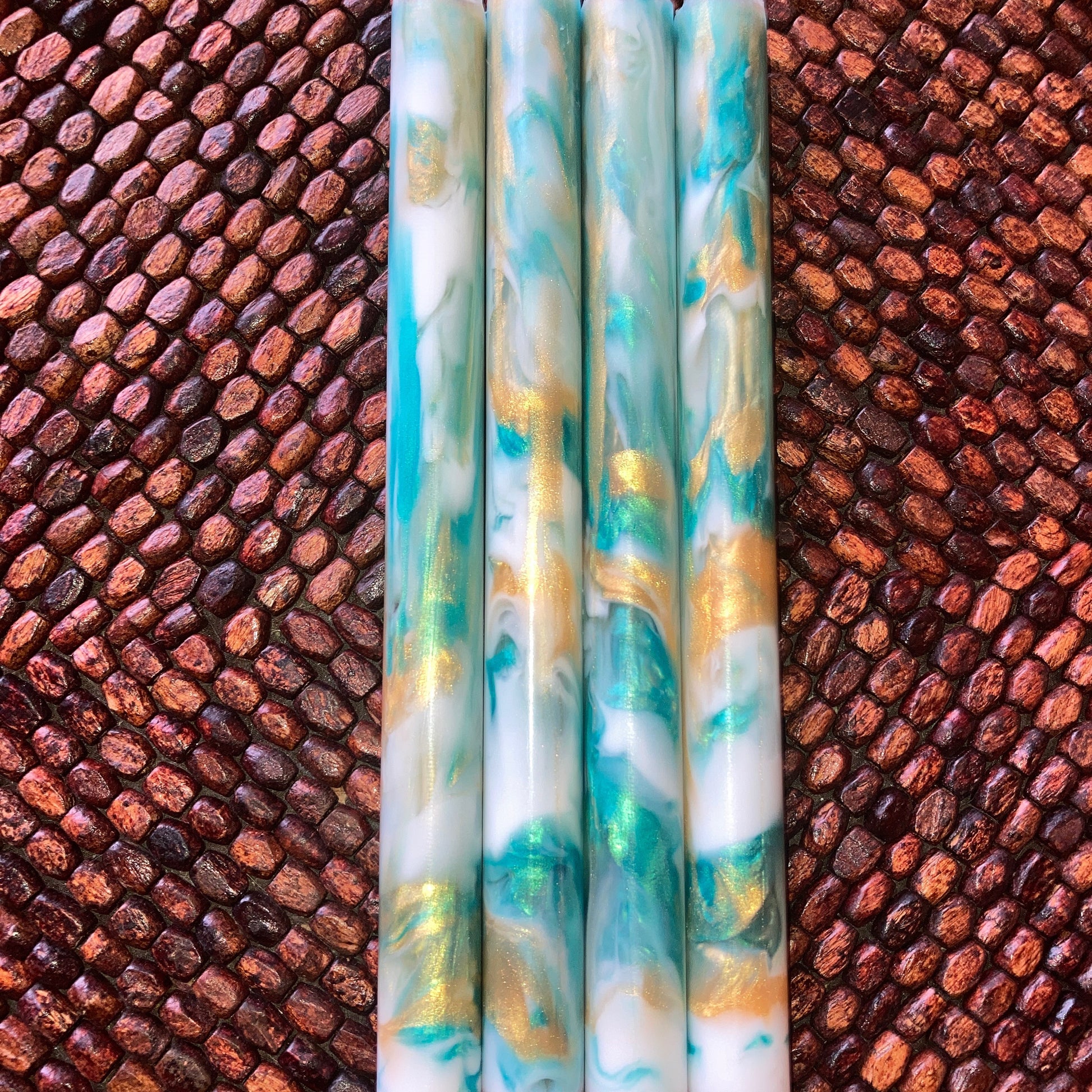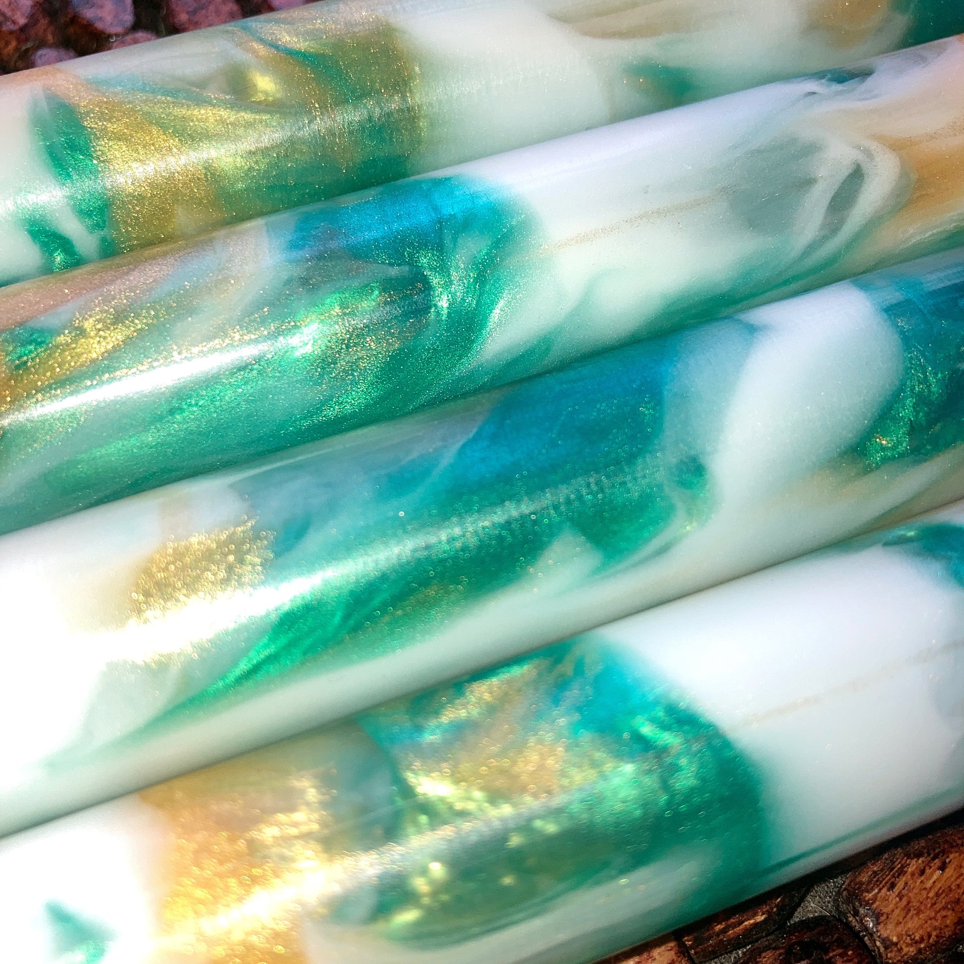 Turquoise waves rolling on golden sands. Envision this tranquility with each turn of the Pen. Beautiful Emerald and Turquoise swirl in with gold and white to create this custom Fountain Pen.