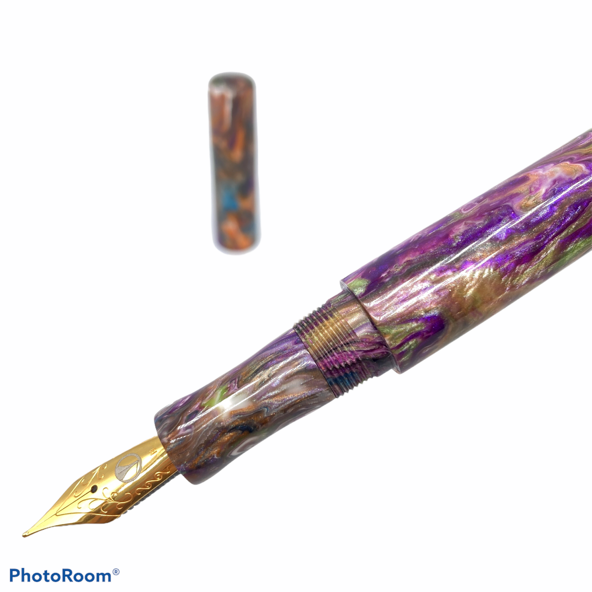 Mystery Machine is a custom Tailored Pen Company blank. Poured and cured in our own workshop. Each pour has the same colors but every one is unique in swirls and patterns created from the pour process. Please note that the pen pictured will not be the exact one you receive, but will be the same colors - swirl patterns vary with each blank.