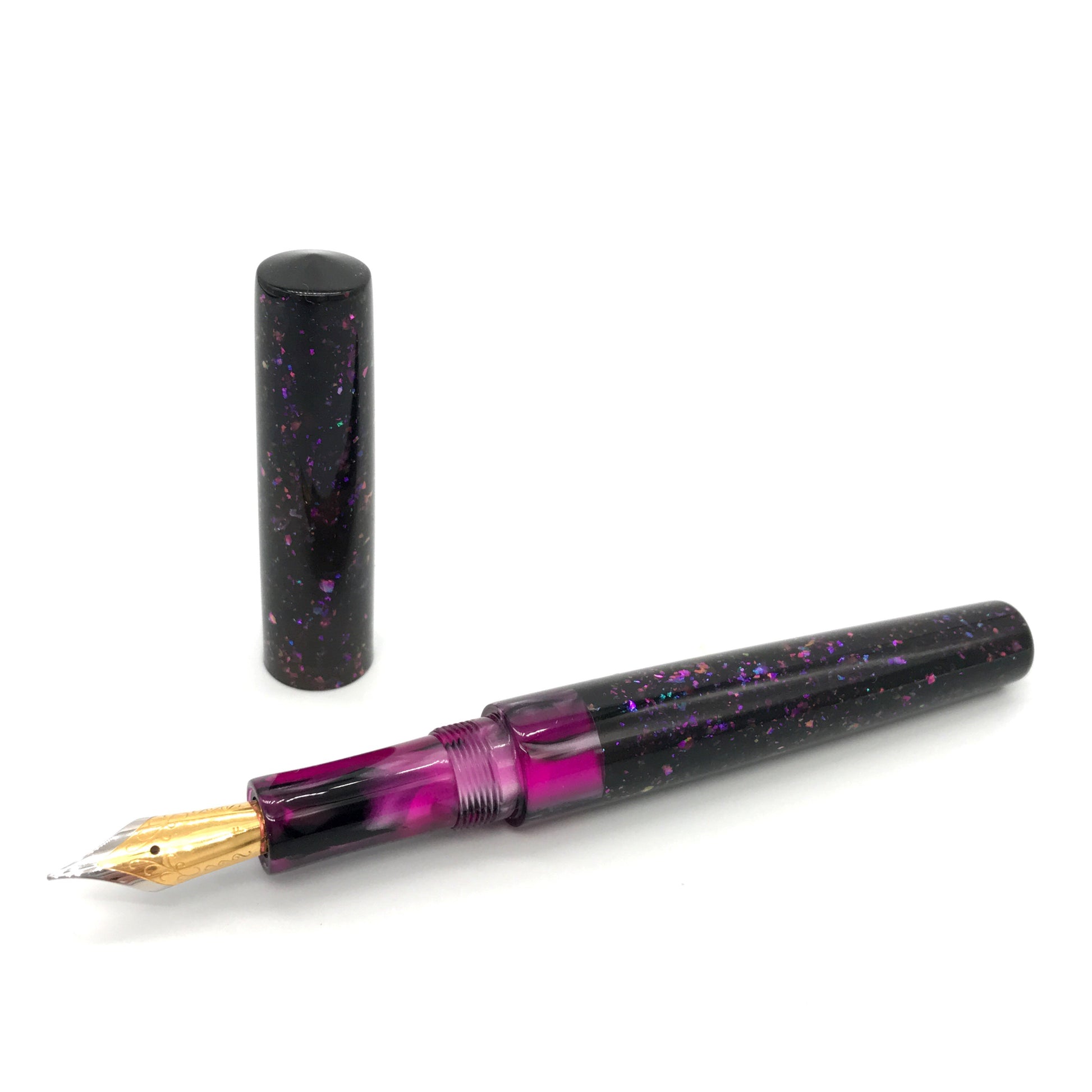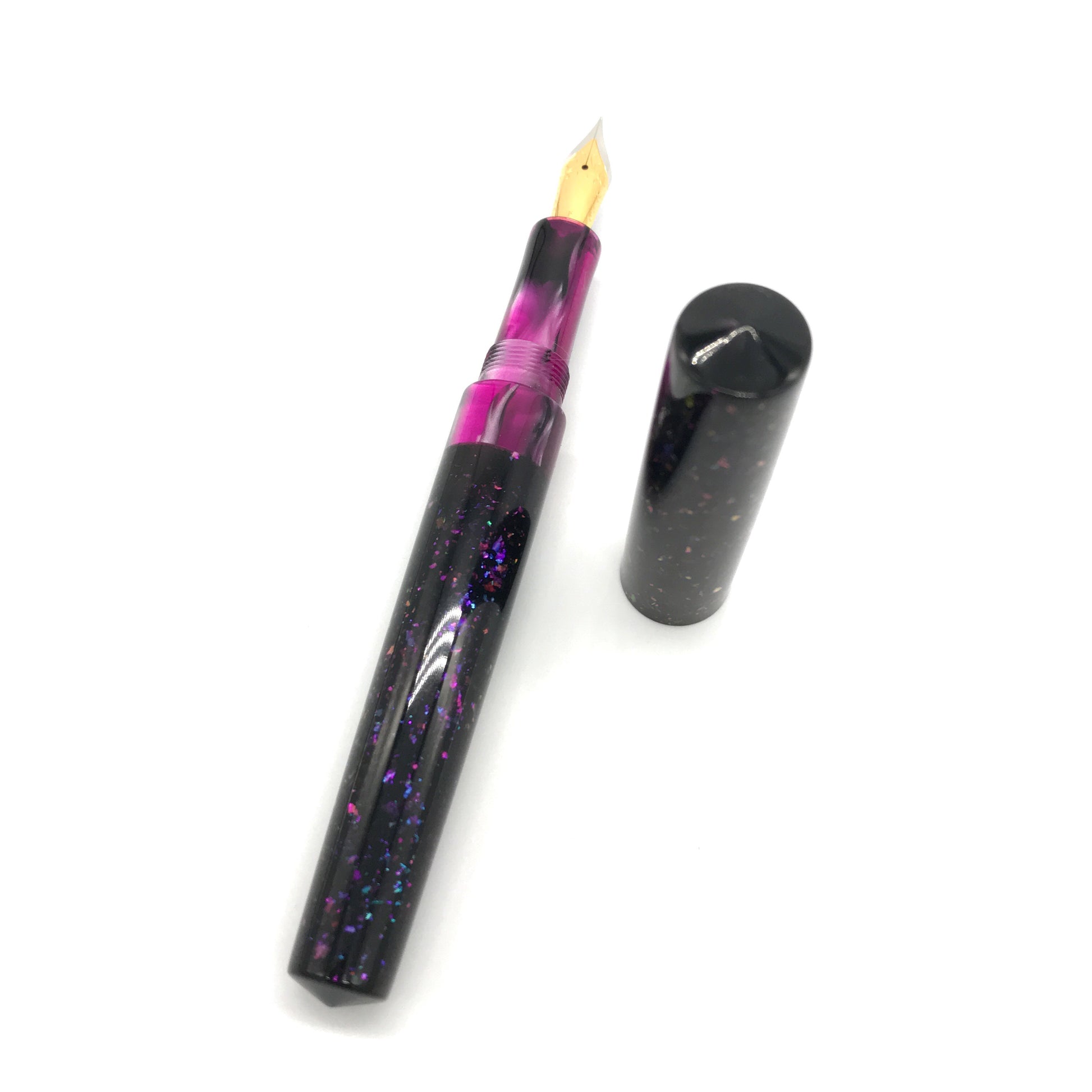 Beautiful reds, blues and purples sparkle and shine around a pink and black swirl section that extends down the body of this custom Tailored Pen Company Fountain Pen. Named for the Sentinel Nebula with a vast array of colors and twinkling stars. Our Nebula series original blanks are created and cured in our own workshop for a truly unique Fountain pen. Each turn of the pen reveals a vast array of colors.