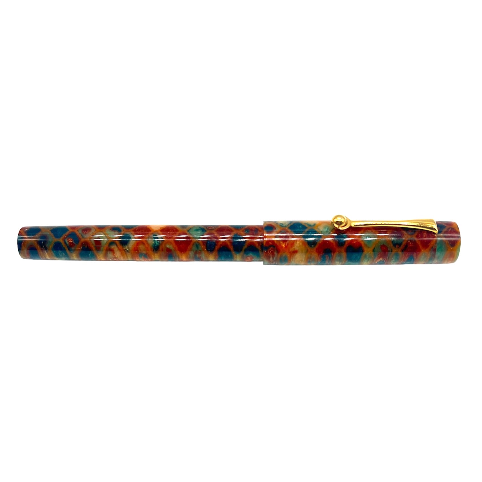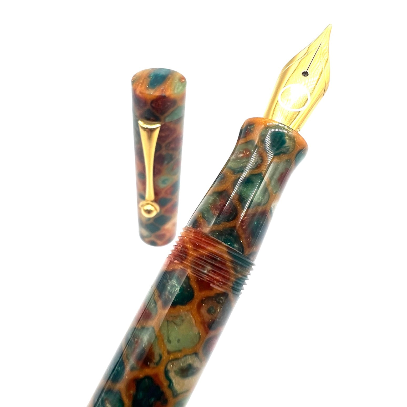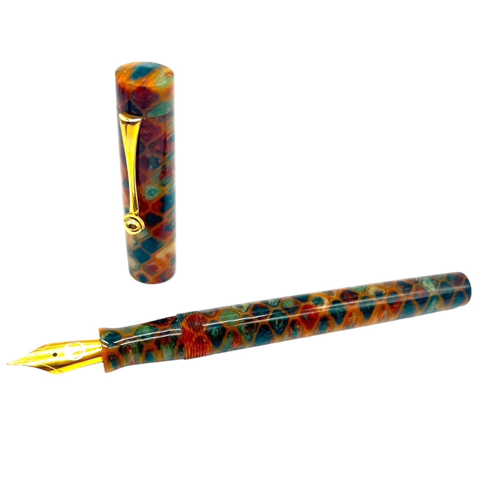 An array of greens, gold and copper create a Stained Glass vibe. Set in a golden motif, this pen is elegance in the hand. (Pictured here in our Westminster style with a gold clip, jowo #6 nib and the Moroccan Lattice motif)