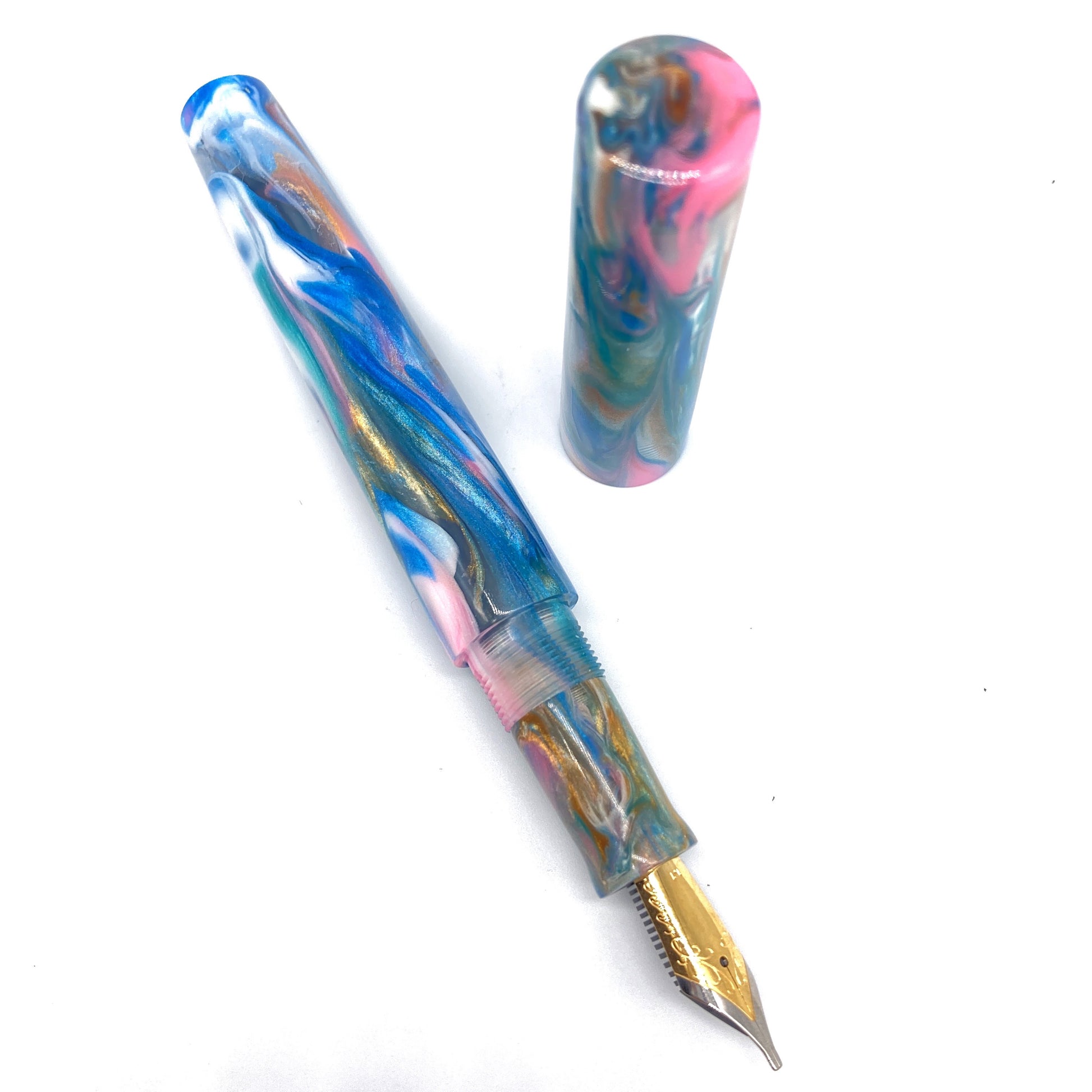Inspired by the colors of a stunning sunset on the coast of Australia, Sunset Reverie is full of vibrant colors playing off the clouds and ocean from a setting sun. Sunset colors of pink, blue, gold, teal and more intersperse with clear to create a semi transparent colorful custom Fountain Pen. Choose your own style, nib and clip options to create a pen uniquely yours.